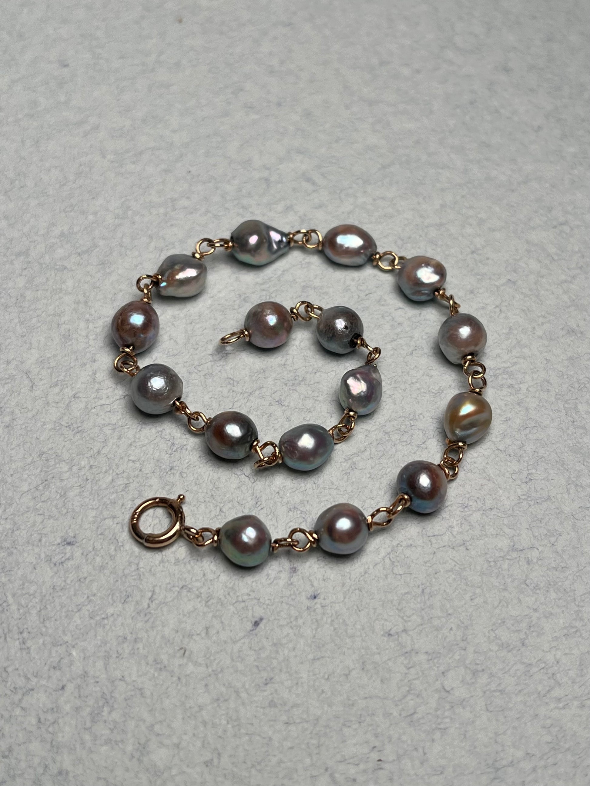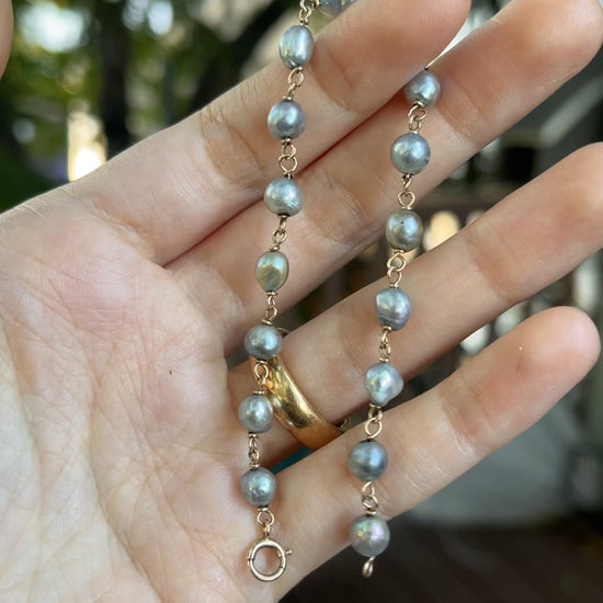 This antique pearl chain bracelet is modeled in 10K rosy-gold throughout, and features a collection of baroque silver/blue cultured pearls. It weighs 4.6 grams, and measures 7 inches long, though it would fit a little smaller. The pearls show signs of age-related wear, as pictured.