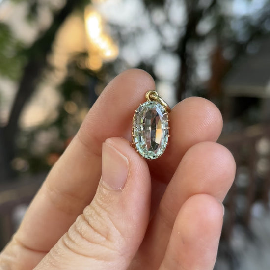 This antique pendant is modeled in 14K gold throughout, featuring an old-cut aquamarine of approximately 4 carats. It weighs 1.9 grams, and measures 14 x 9 mm excluding the bail.