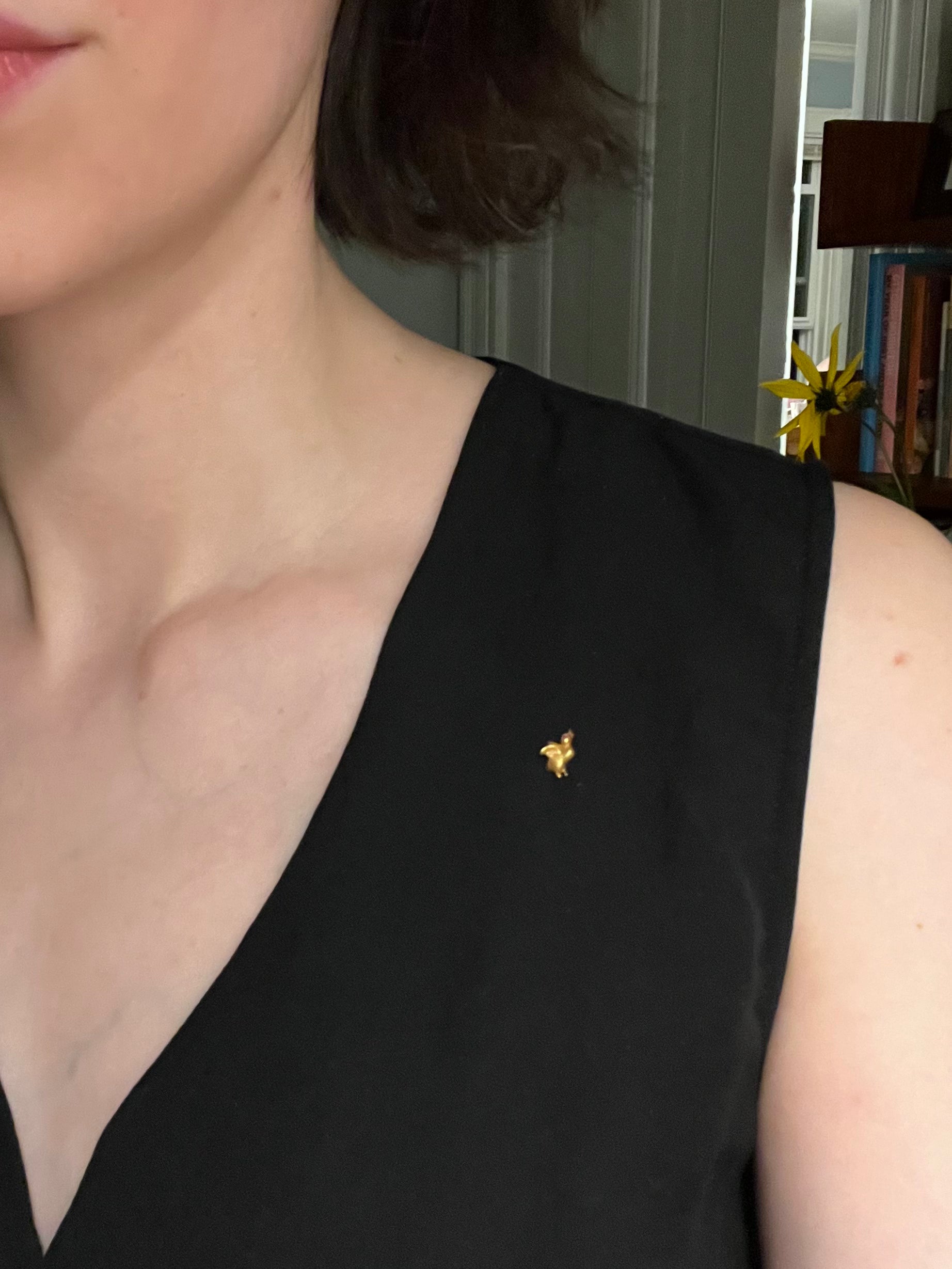 This antique duckling stickpin dates to the early 20th century. It is beautifully made in 14K yellow gold with a bloomed finish, and a tiny ruby eye. It weighs 1.2 grams, with a 9.5mm pin head.