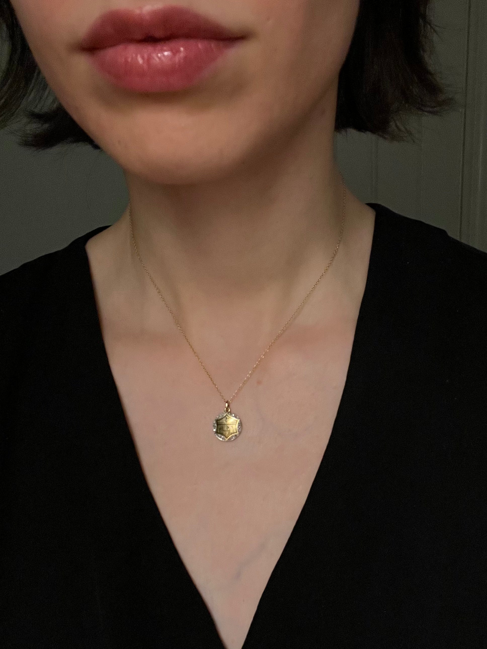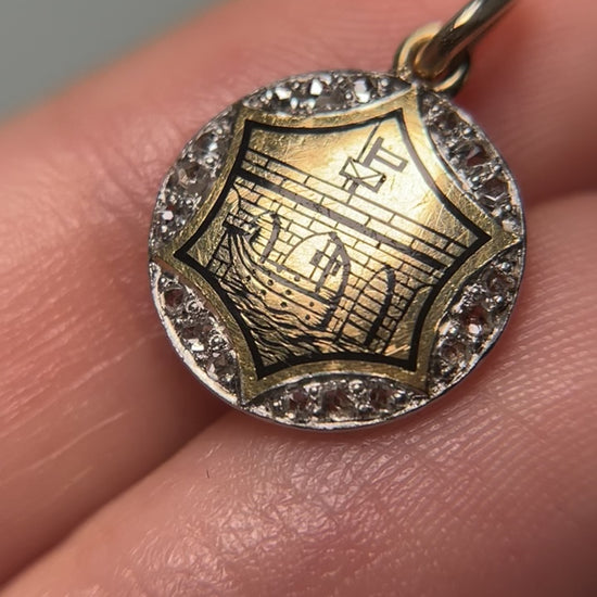 This antique charm is a brooch conversion, which appears to depict a Venetian scene with a gondola, canal and bridge. It is in nearly perfect condition for it's age, engraved 1908 at the back. It is modeled in 18K yellow gold with a bloomed finish, as well as small amounts of platinum for the rose-cut diamond settings (~0.25ctw), and fine taille d'épargne black enamel. It weighs 2.1 grams, measures 12mm excluding the bail, and is marked "JE Short 1908, S&Co 18K".
