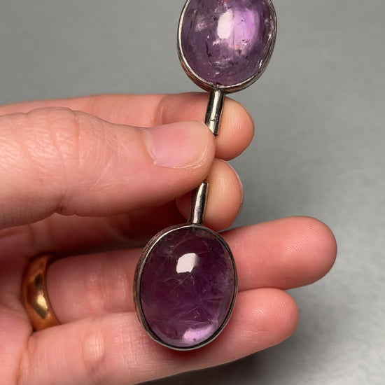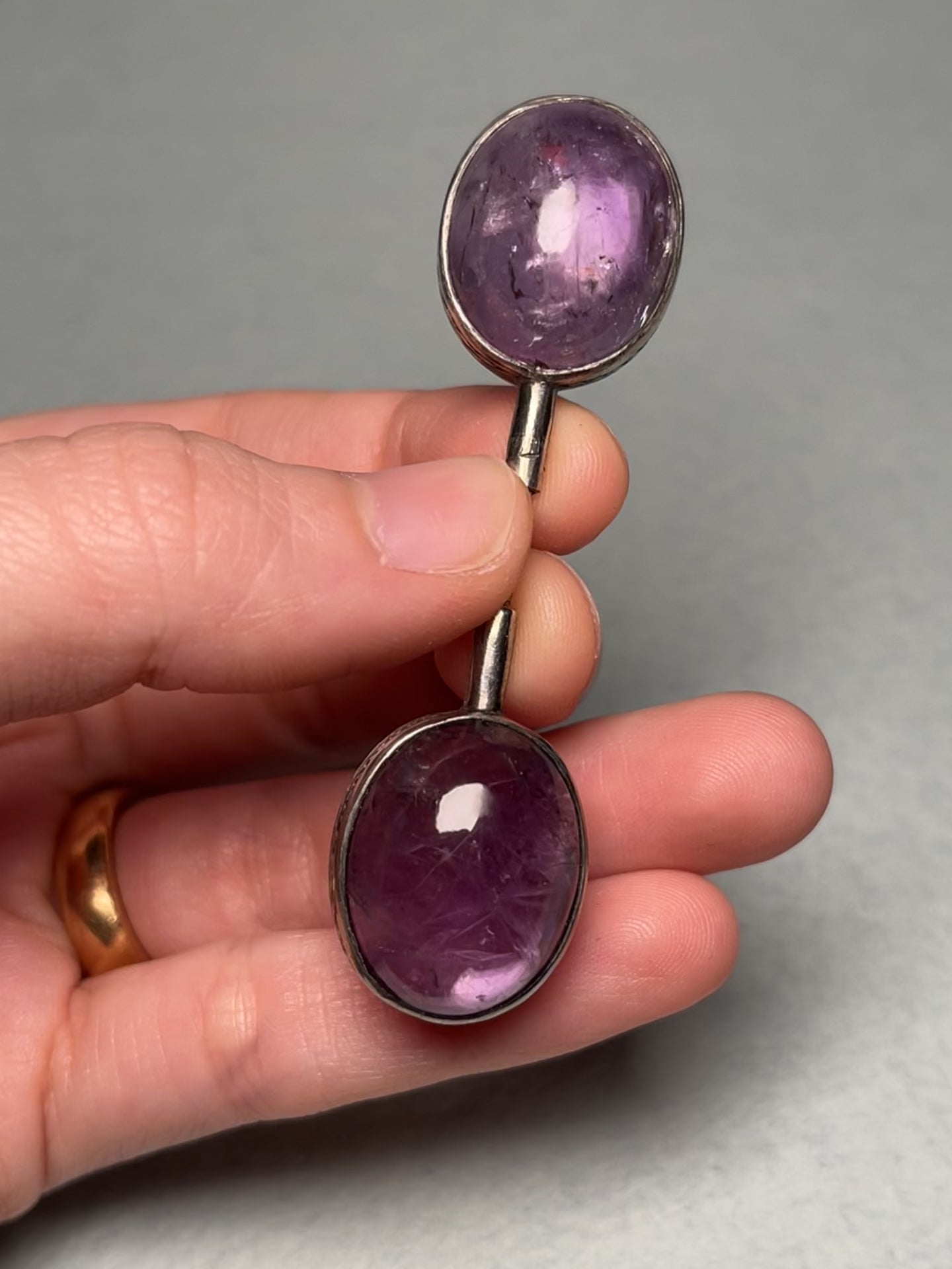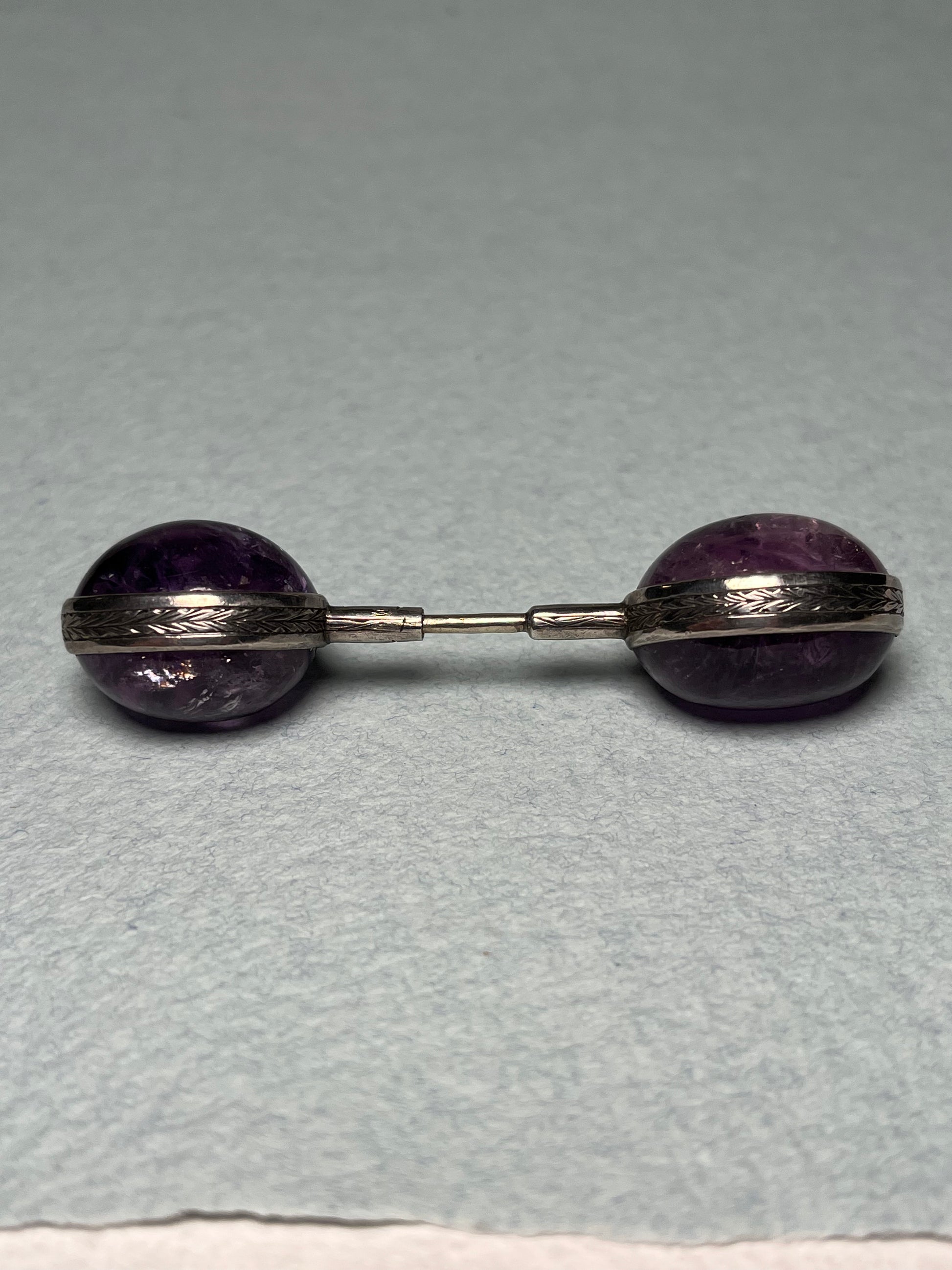 This antique jabot pin/ cloak closure is modeled in sterling silver, completely hand made and hand engraved. It features two large amethyst orbs. It measures 20 grams, and would easily be convertible to earrings or pendants.
