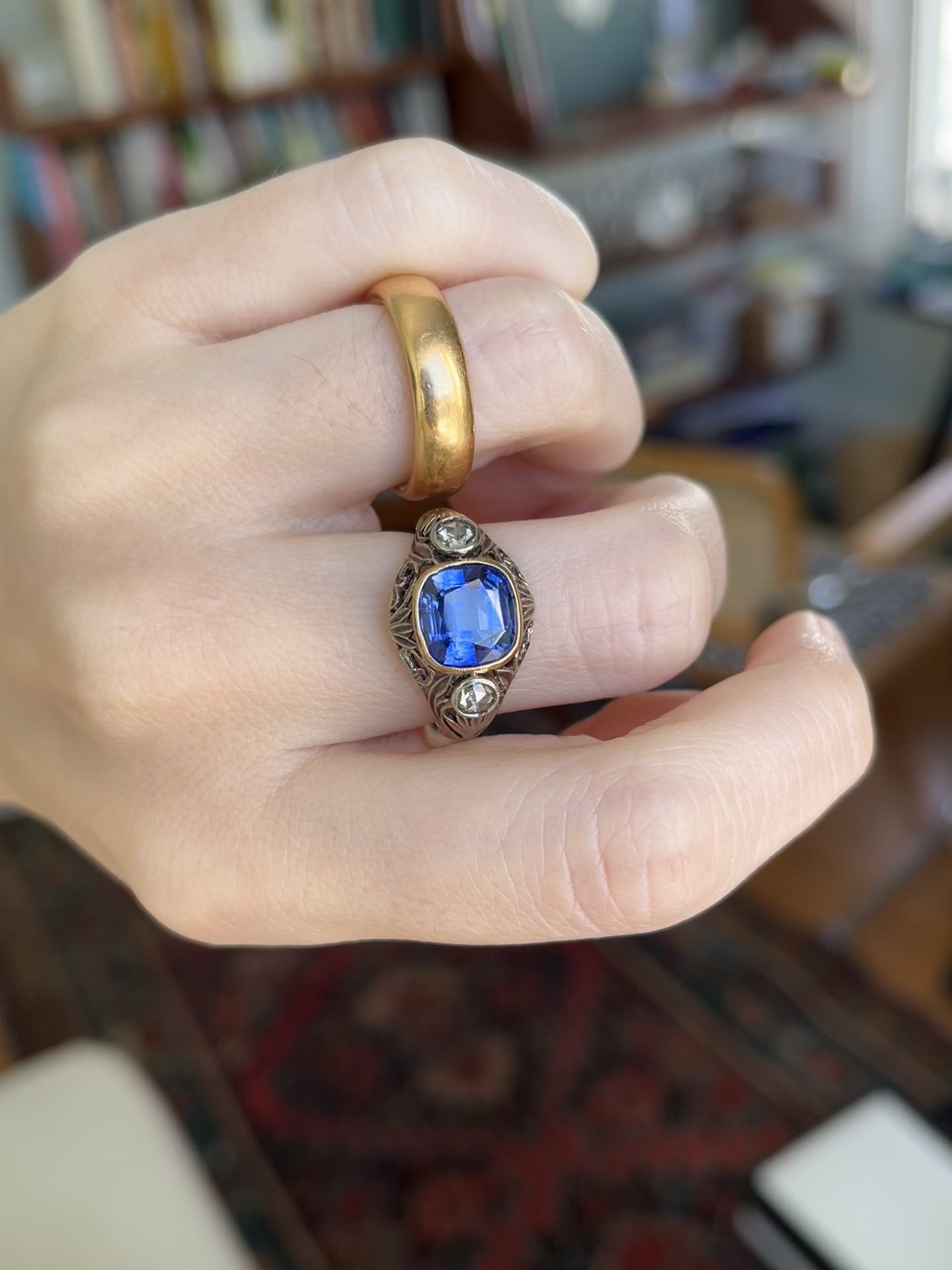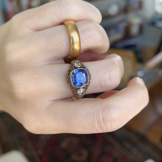 This antique Italian Art Deco ring is modeled in hand-carved 18K yellow and white gold, with intricate engraving and pierced details, and features an early synthetic sapphire (~3 carats) and two natural rose-cut diamonds (~0.30ctw). The sapphire is hand cut in an old style with an open culet, and is not a typical shade for a lab grown stone.