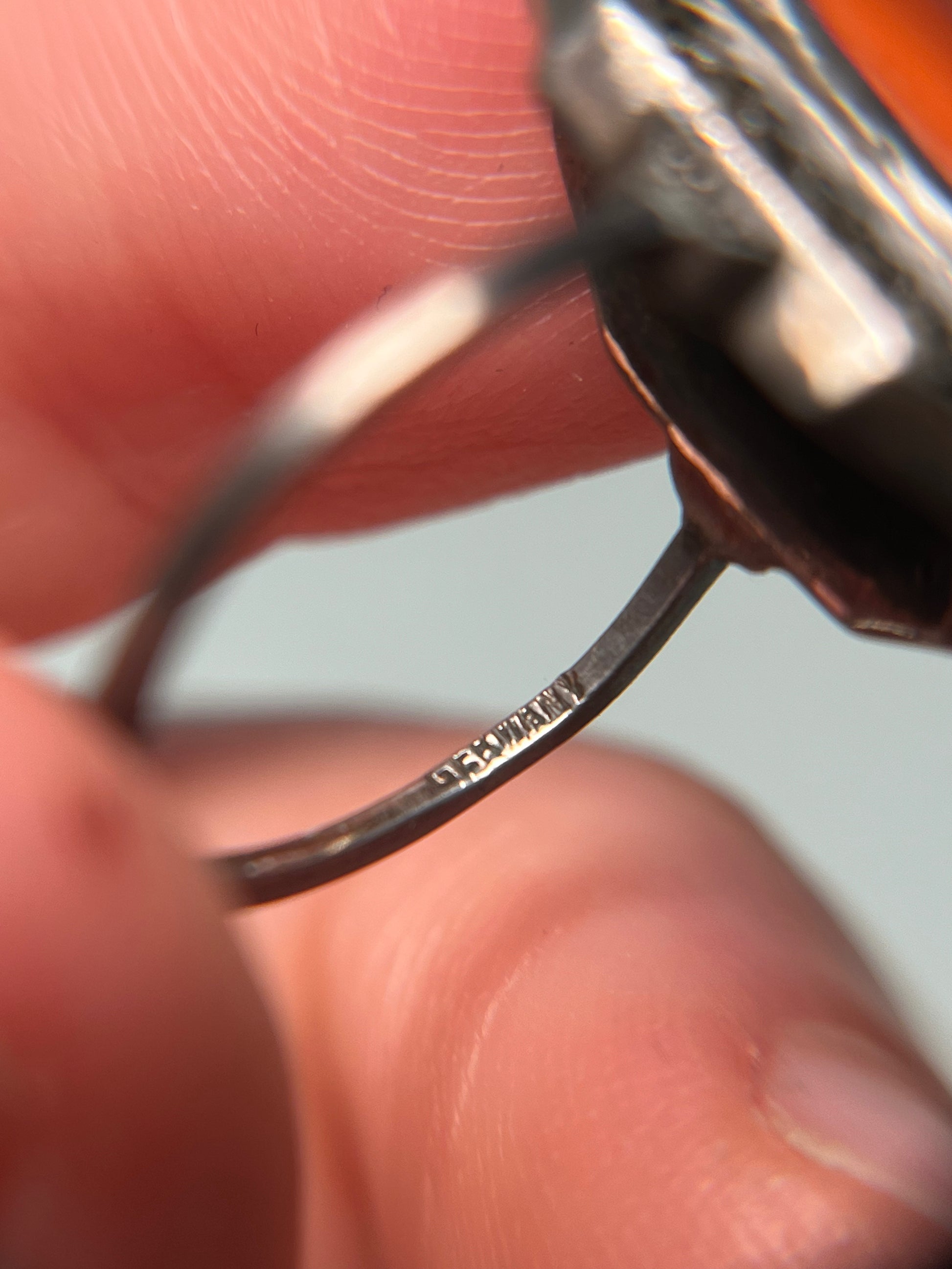 This deco-era ring is modeled in sterling silver, featuring a natural coral cabochon and marcasites. It is marked "sterling" and "Germany" c. 1920s. It weighs 2.7 grams, and fits between a size 4.75 and 5.