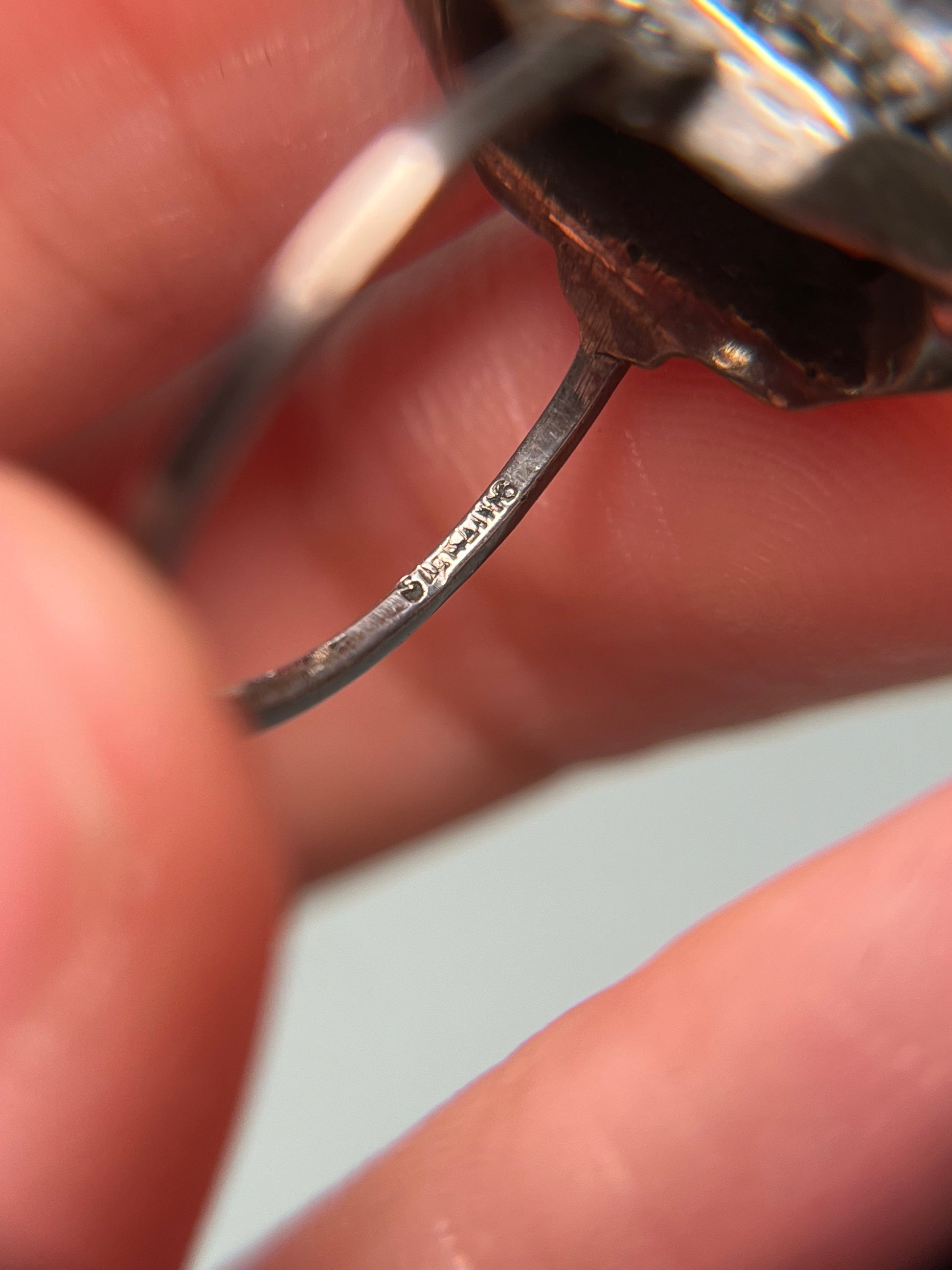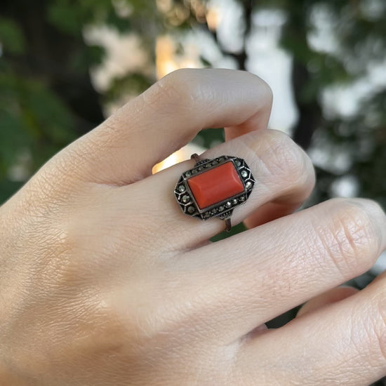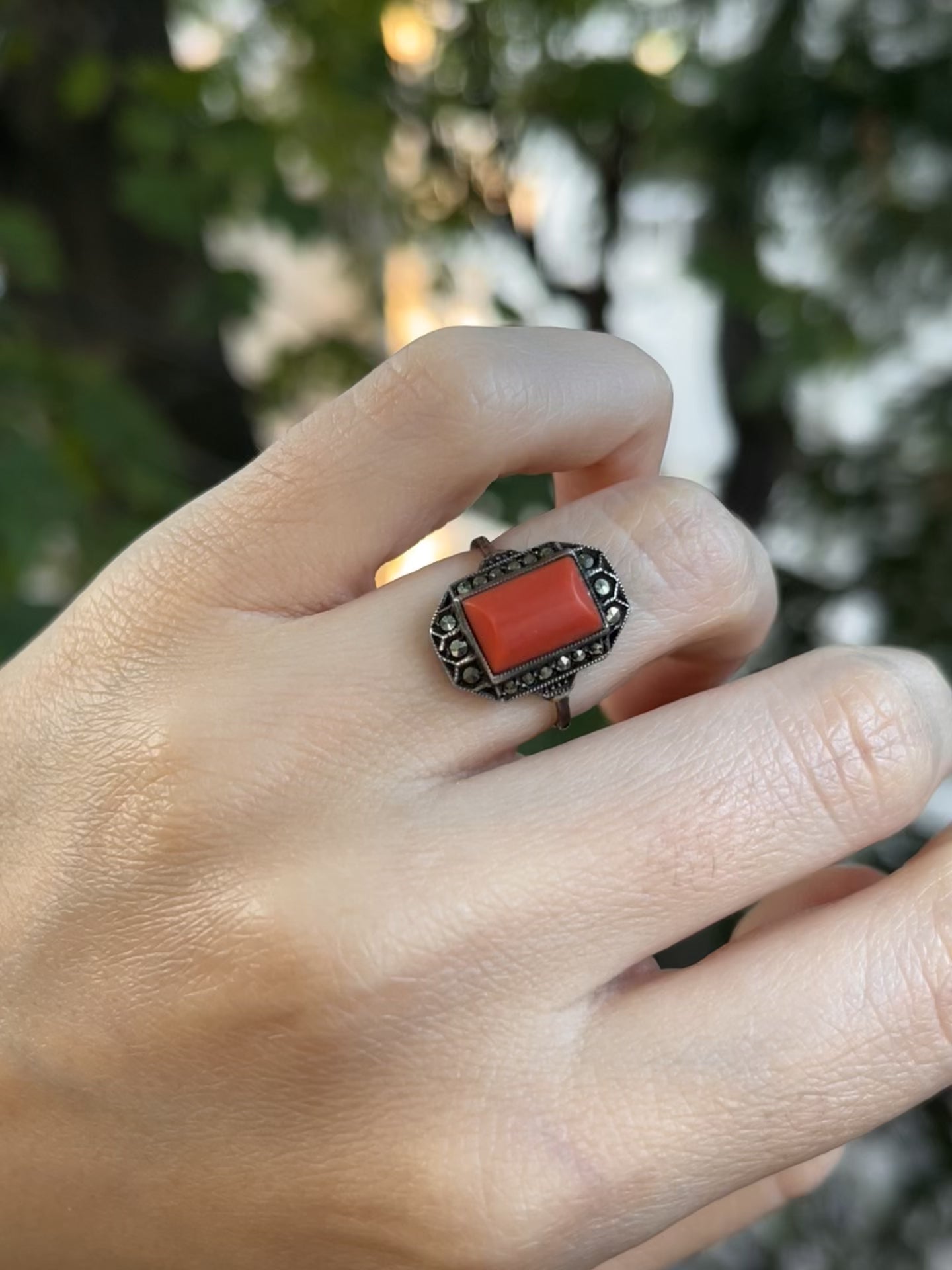 Antique Sterling, Coral and Marcasite Art Deco Ring