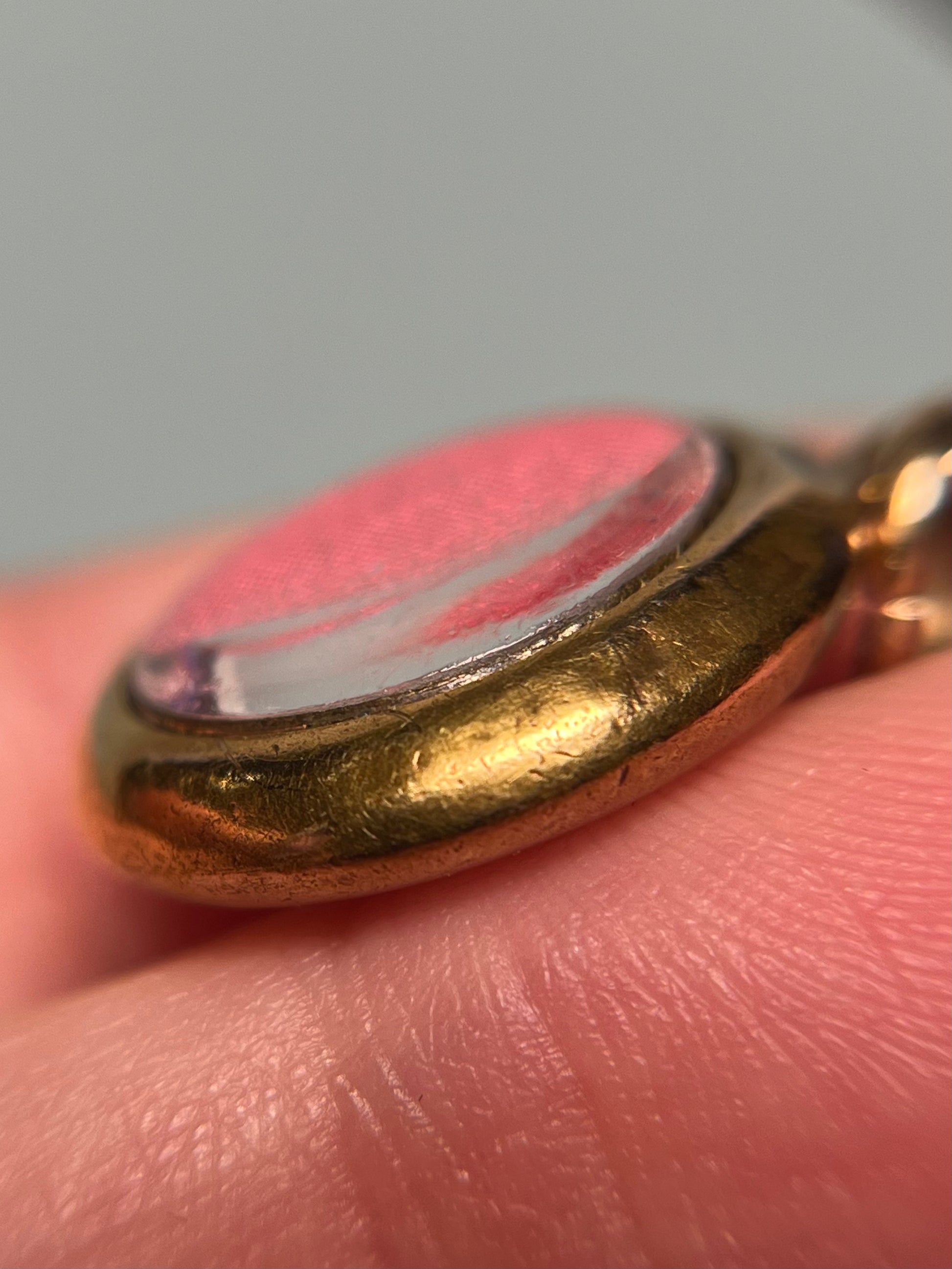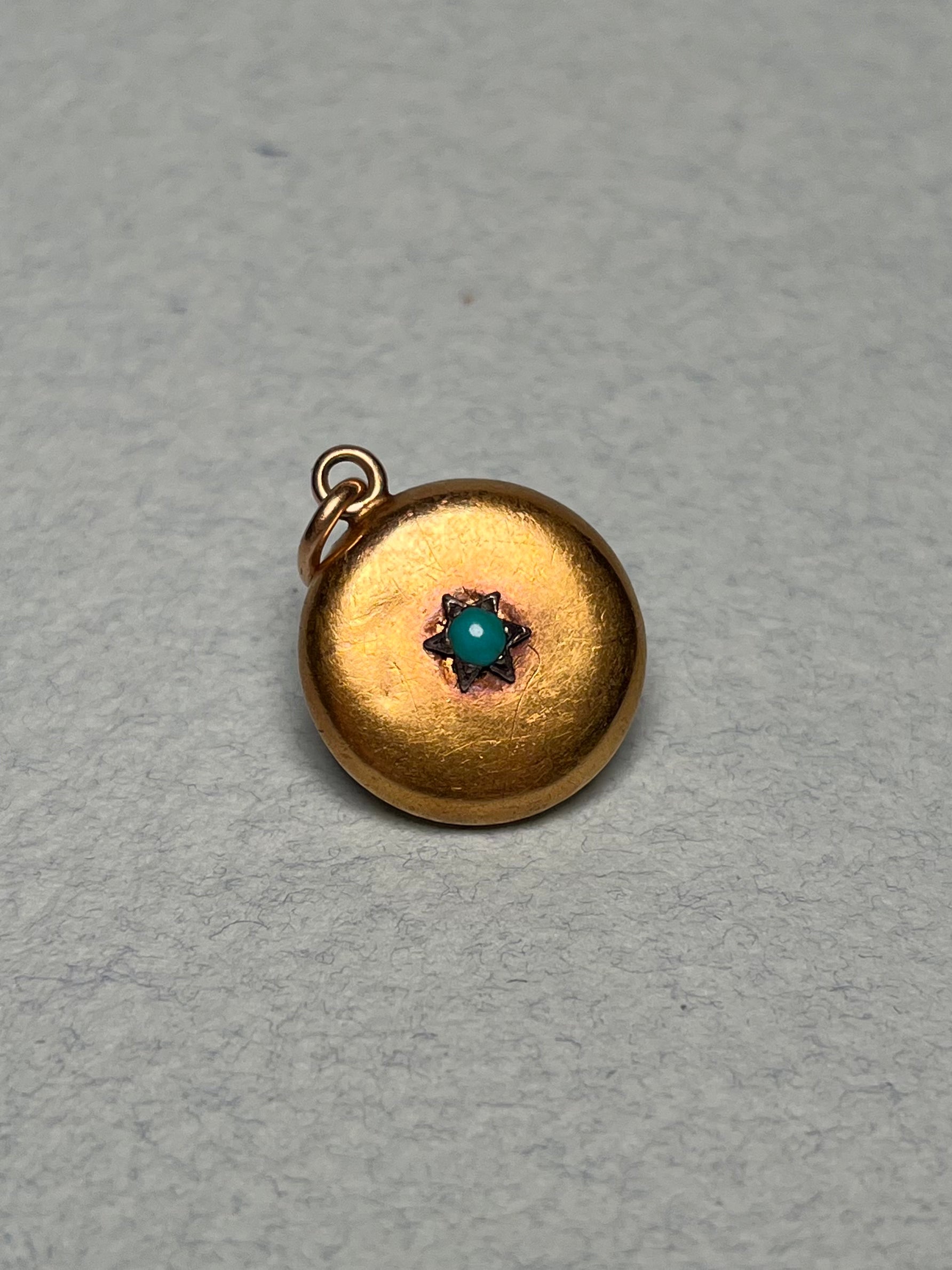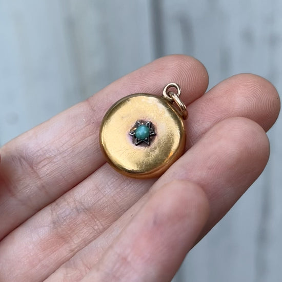 Modeled in 15K gold and sterling where the turquoise cabochon is set. This antique locket pendant features a glazed panel at the back with beautifully preserved pink silk behind the glass. It measures 17mm excluding the bail, and weighs 2.3 grams. As pictured, there are dents and wear to the surface of the locket. The back can be opened by professional jeweler, and if you have a particular photo or keepsake you want to insert, I can help you do that.