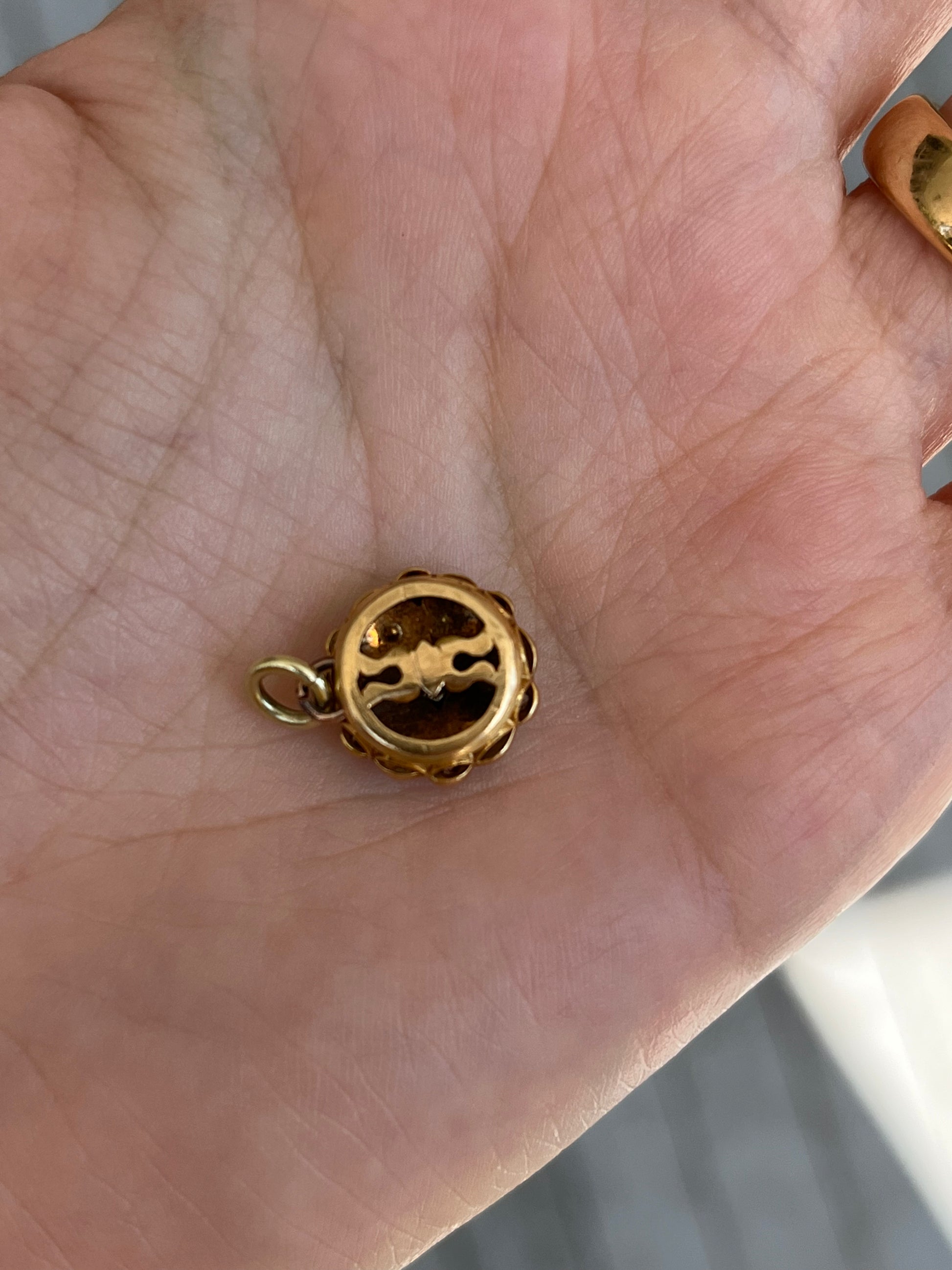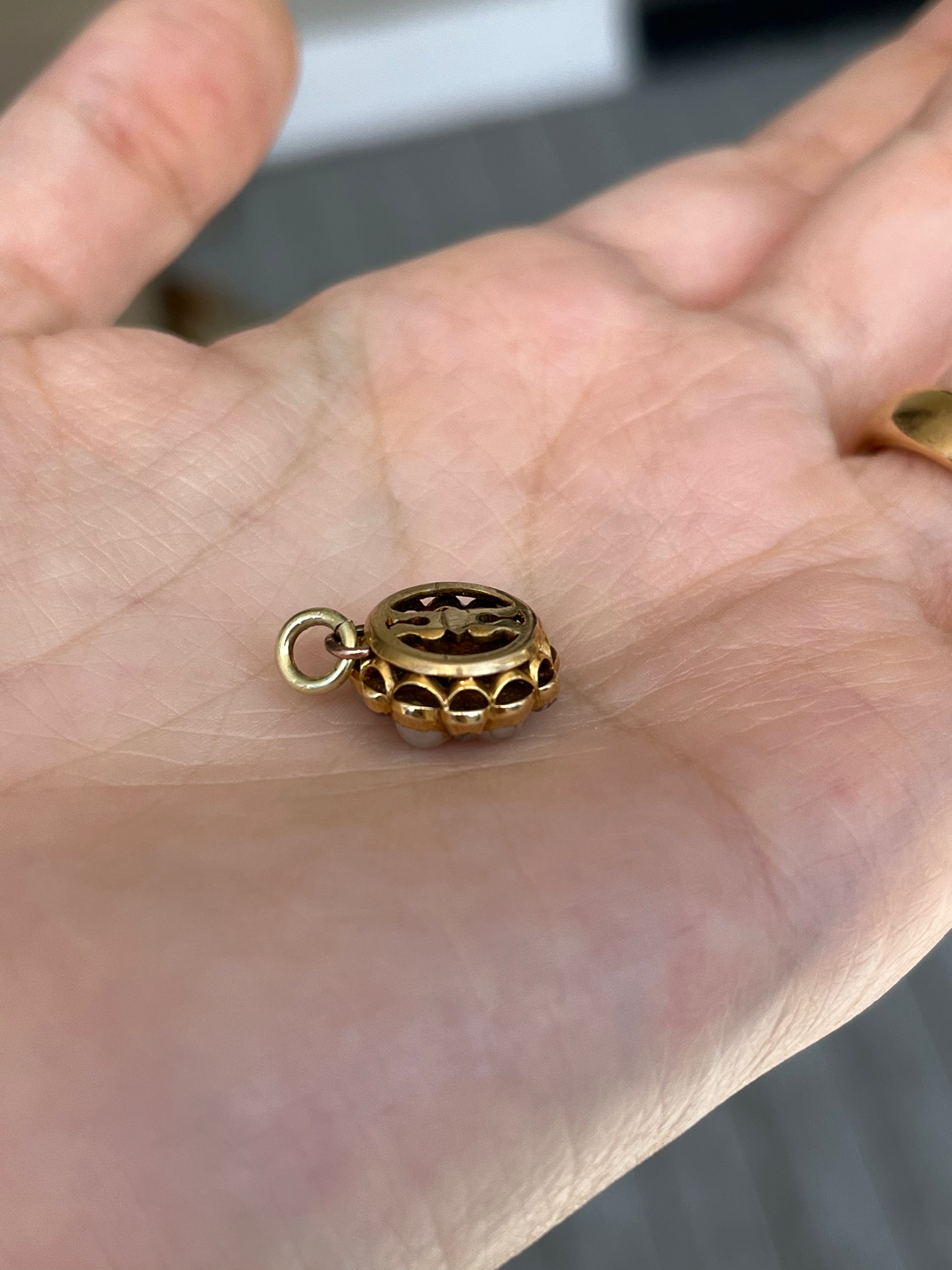 This is a natural pearl and old mine cut diamond pendant, with rose cut diamond accents. The central old mine cut diamond is 3.5 mm x 2.5mm, estimated 0.15 carats. The rose cuts are 2mm each, with chunky faceting, estimated 0.18 carats. The total estimated diamond weight is 0.30 carats . Pearls average 4mm each. Cluster is 13mm excluding bail. Acid tests as 18 k, 14k bail. The two jump rings making up the bail are not soldered, but looped through the setting.