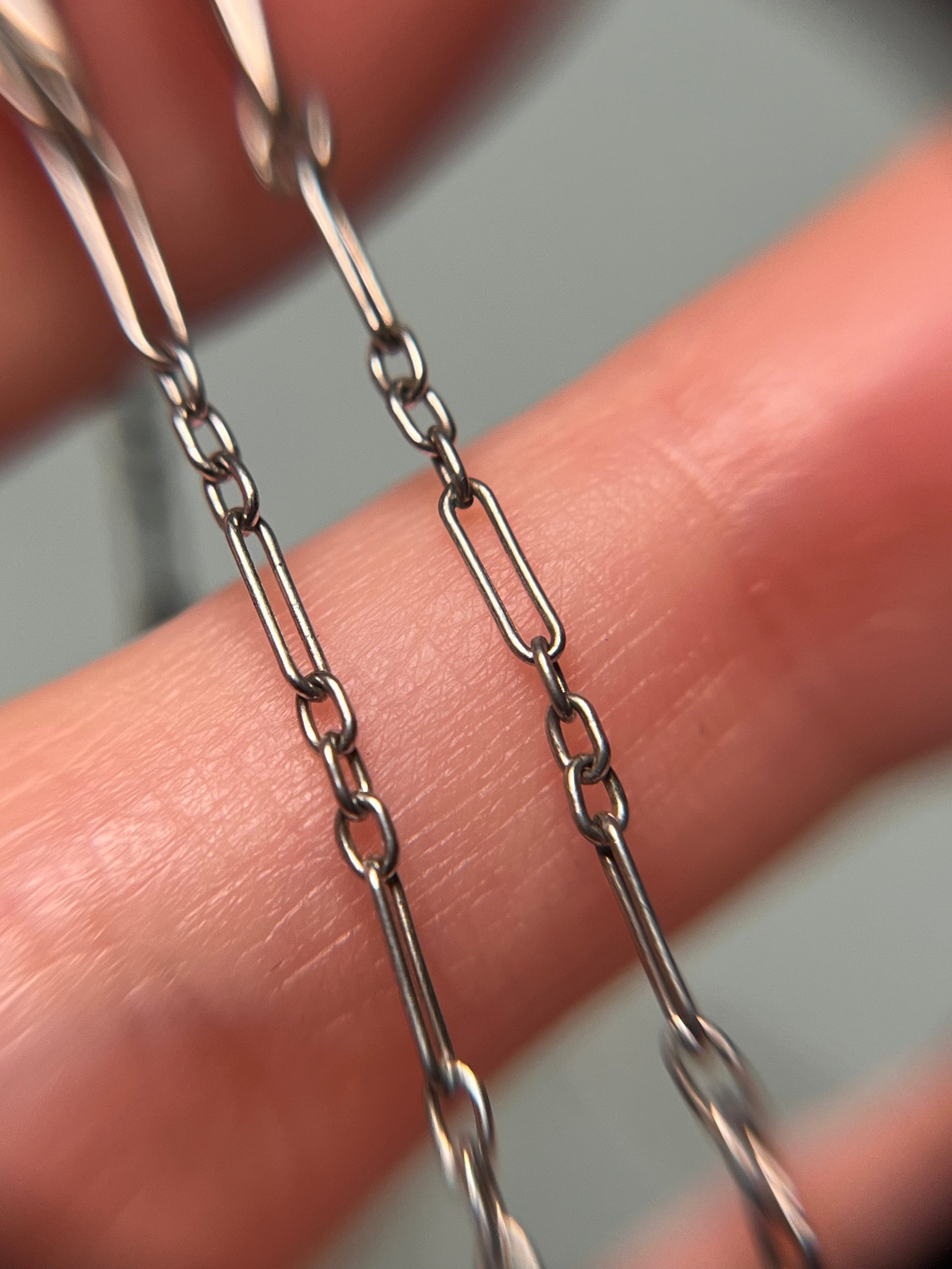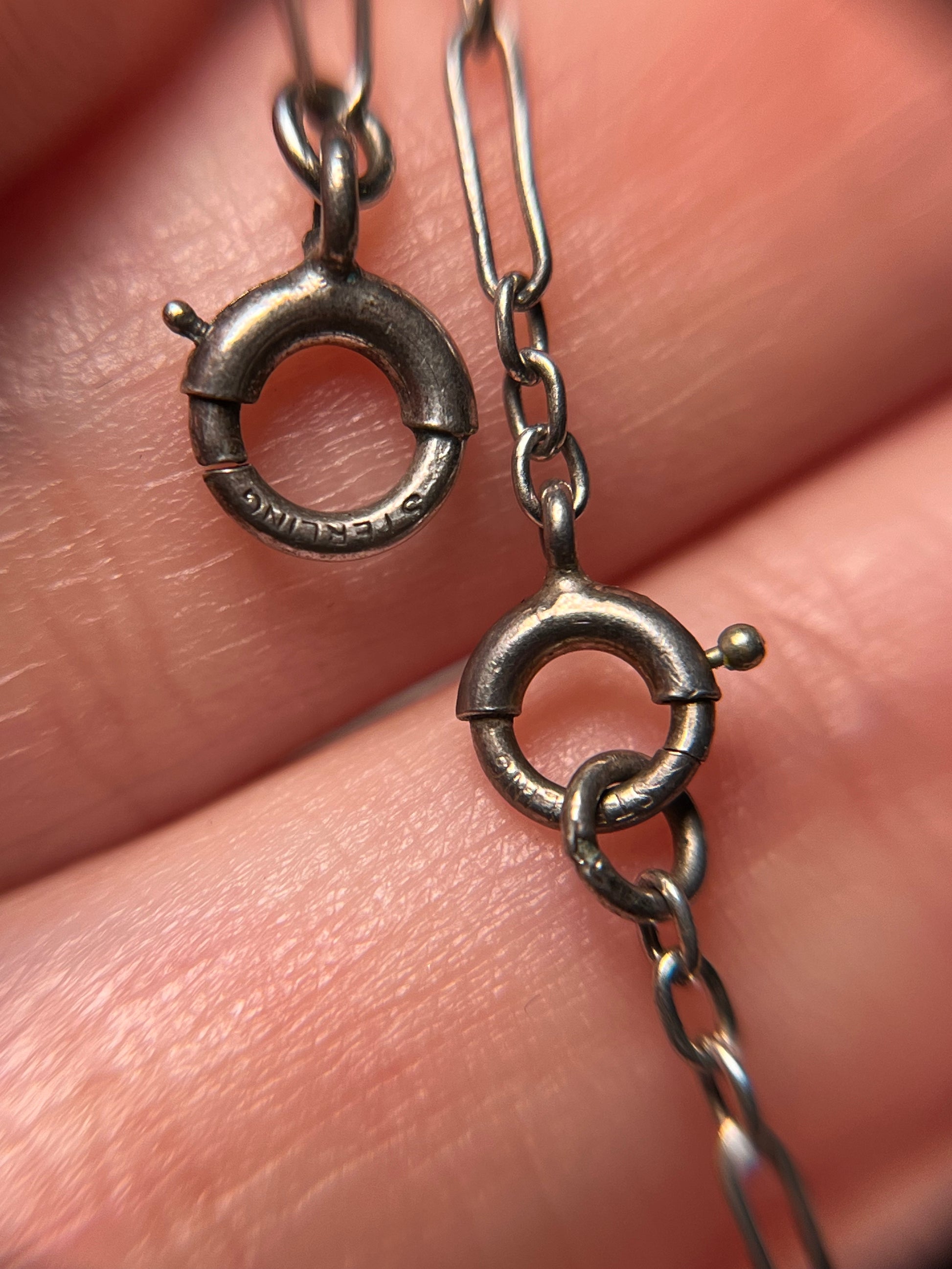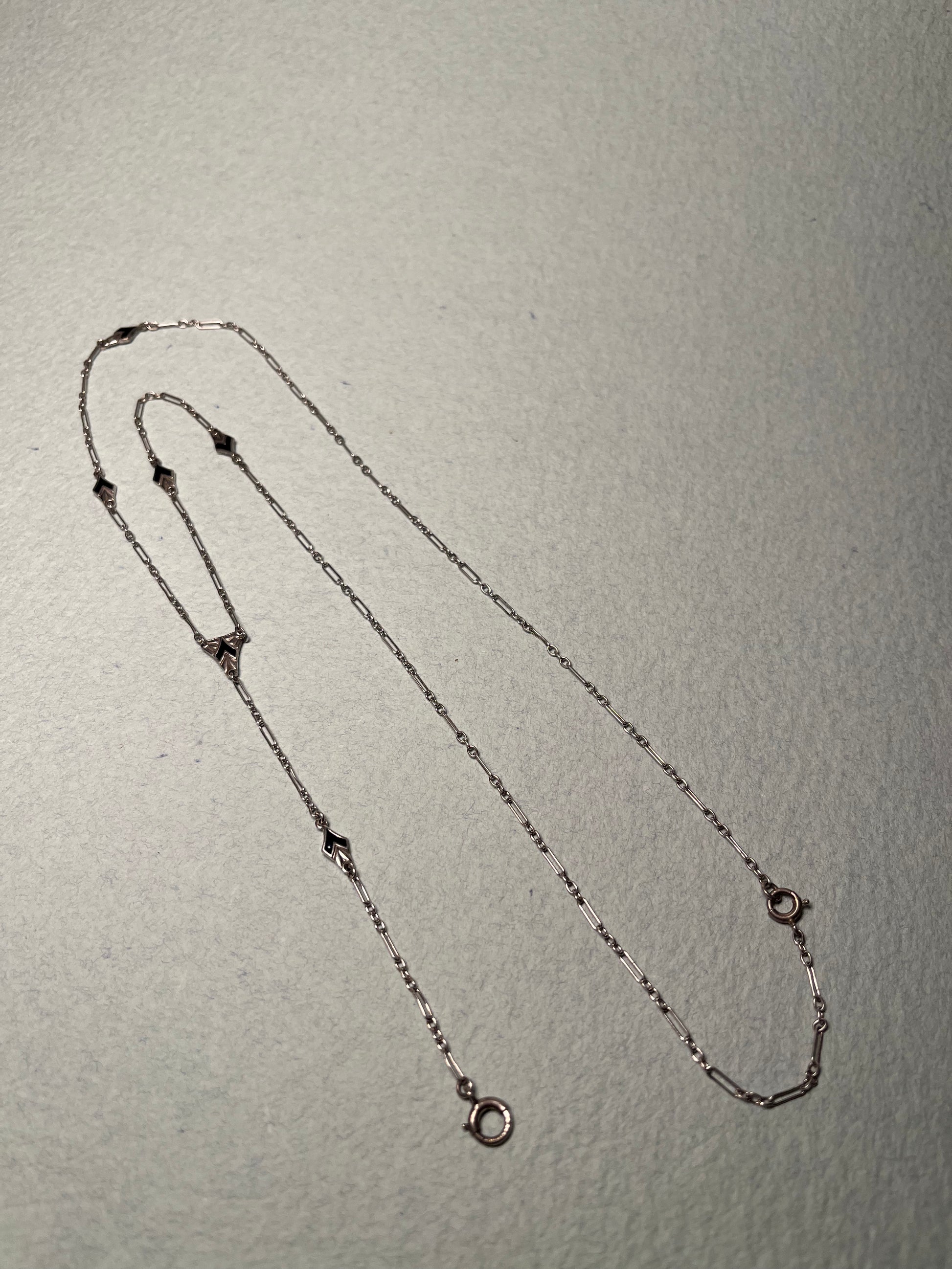 This antique deco-era lariat chain is modeled in sterling silver with black enamel details. It weighs 5.4 grams, and measures 24 inches + a 4 inch drop with a clasp at the end to hang a pendant.